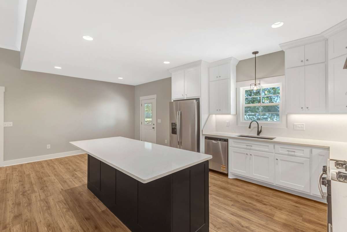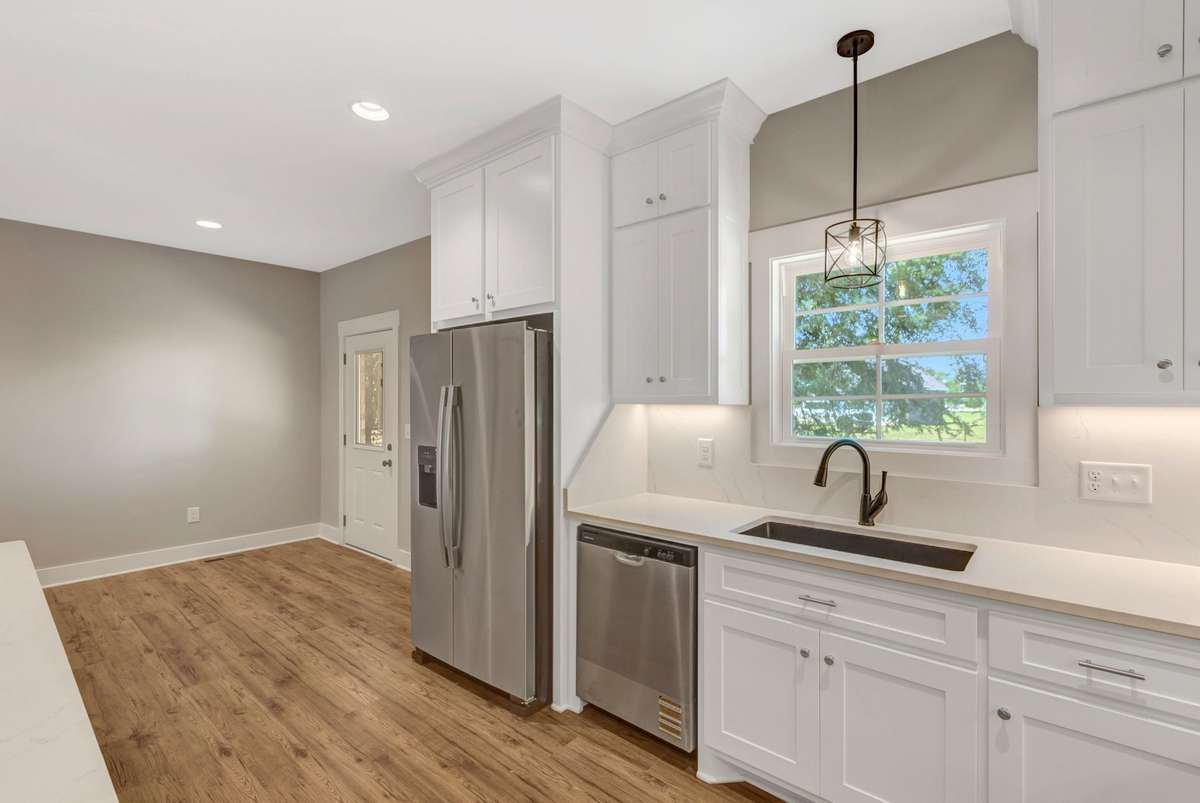 Beautiful all- brick 3 BR, 2 BA home on a 1. 04- acre wooded corner lot. Features include quartz countertops, laminate wood flooring, 9–11 ft ceilings, and a gourmet kitchen with oversized island, floor- to- ceiling soft- close cabinetry, stainless appliance package including gas stove, and a pantry closet. Primary suite offers a tray ceiling, 8x8 walk- in closet, dual vanities with LED mirrors, and tiled shower. Covered porches, an encapsulated crawlspace, on- demand hot water, and concrete drive complete this stunning home. Receive up to 1% Lender Credit using the builders preferred lender—just 2. 5 miles from Hwy 64!