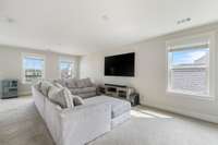 Upstairs, there’s an oversized media room with its own outdoor balcony — perfect for movie nights or game days.