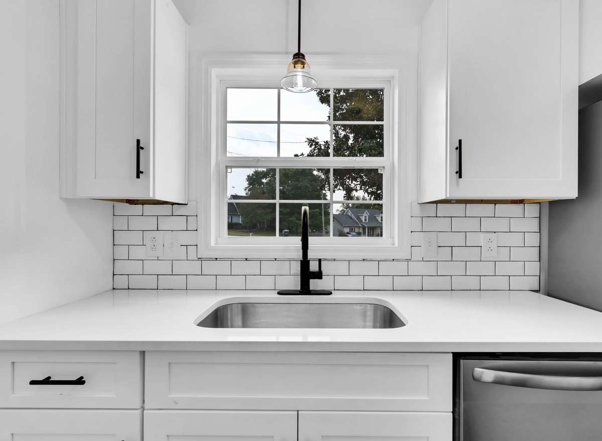 Fully renovated kitchen with quartz counters & subway tile backsplash