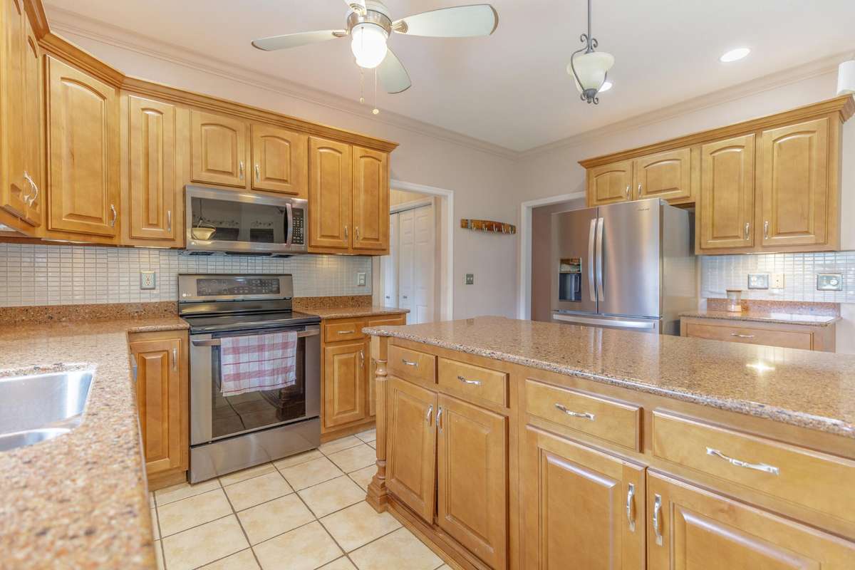 The main- level primary suite is generously sized and includes a walk- in closet, a spa- like en- suite with a jetted tub, and a private sunroom with its own heating and air—perfect for year- round relaxation. Upstairs, two oversized bedrooms with walk- in closets share a full bath.