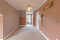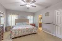 The main- level primary suite is generously sized and includes a walk- in closet, a spa- like en- suite with a jetted tub, and a private sunroom with its own heating and air—perfect for year- round relaxation. Upstairs, two oversized bedrooms with walk- in closets share a full bath.