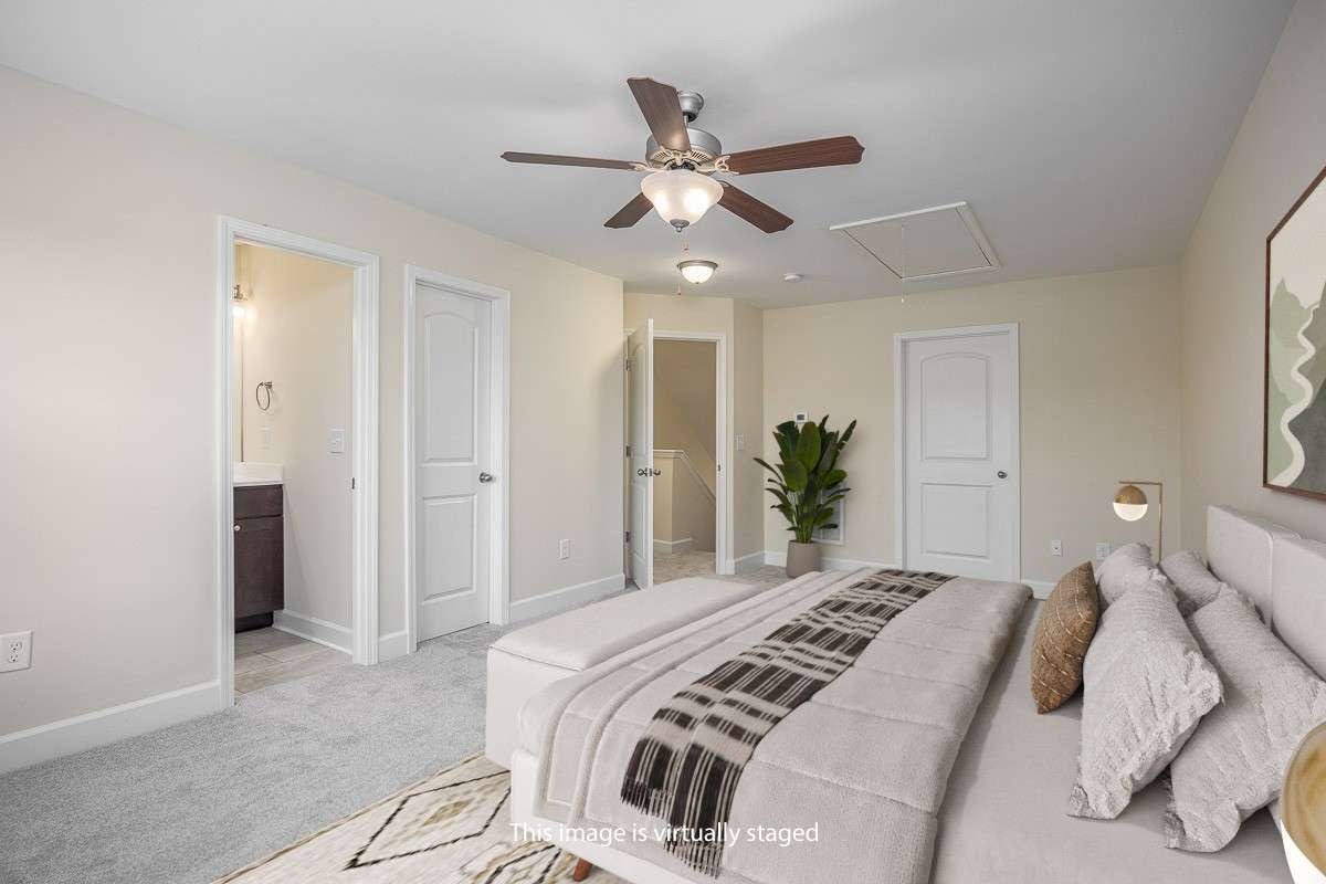 The thoughtfully designed floor plan features a private bathroom in every bedroom, a flex room on the lower level, two walk- in storage areas, a spacious two- car garage, and a large deck with ample guest parking.