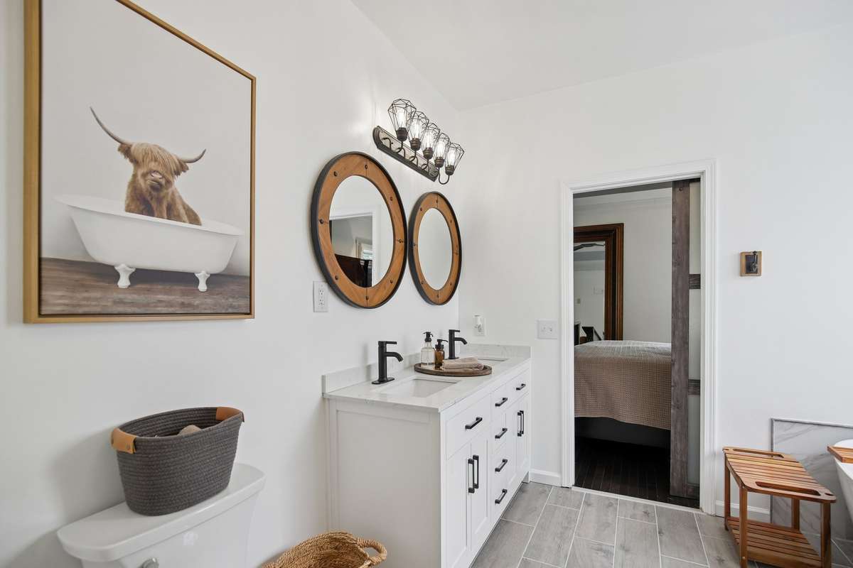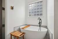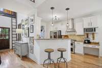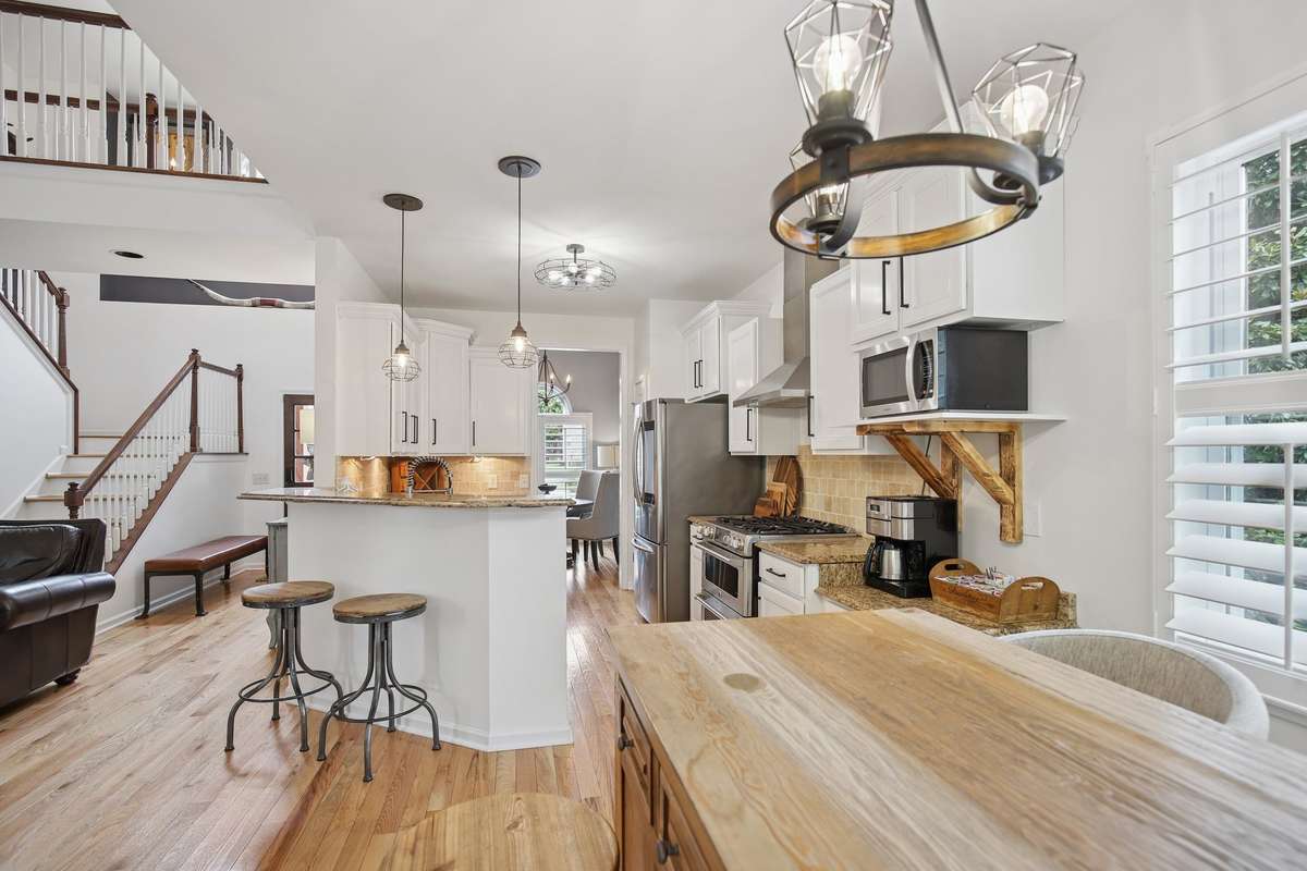 The main- level primary suite provides a true retreat, featuring a spa- inspired bath with a stand- alone soaking tub, tiled walk- in shower, and elevated finishes. The kitchen has been tastefully upgraded for both beauty and functionality, and every room—even the laundry room—reflects meticulous attention to detail and class.