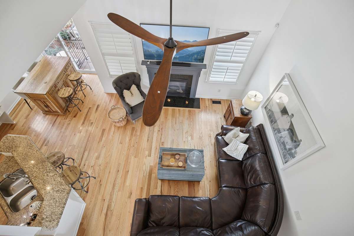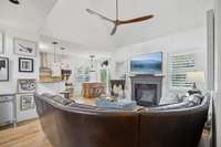 Step outside and discover your private backyard oasis. Enjoy the covered patio with ceiling fans, gather around the stone gas fireplace, unwind in the hot tub with its own overhead flatscreen, or relax beneath the pergola—also equipped with an overhead flatscreen—for effortless outdoor entertaining. String lighting and lush landscaping complete the resort- style atmosphere.