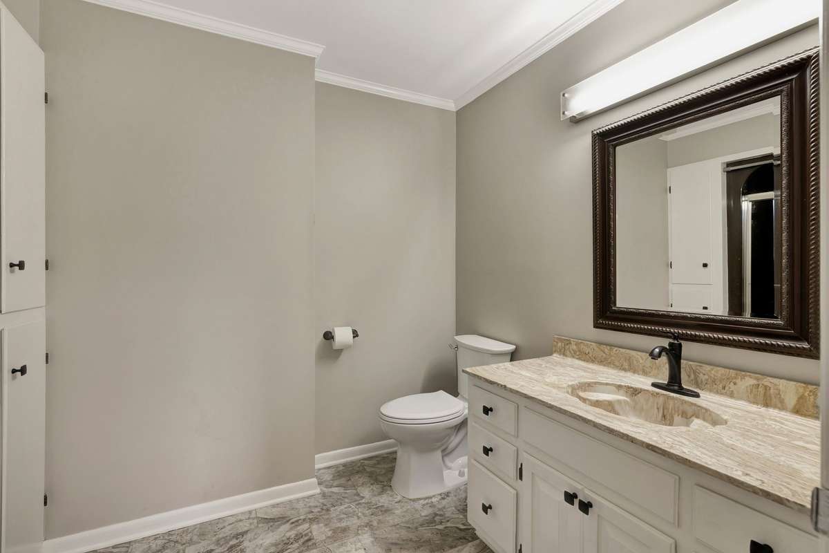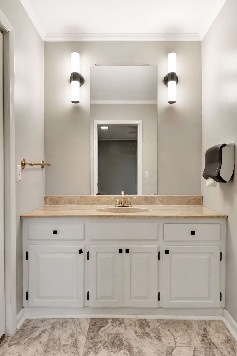 Primary bath with large vanity counter, extra cabinets space, walk in shower, and a secondary closet