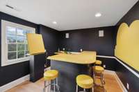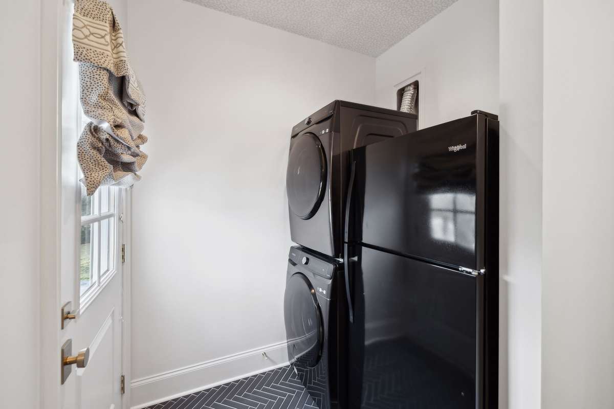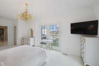 The chef’s kitchen is a showpiece, featuring modern appliances, custom cabinetry, and elegant finishes that balance functionality with refined style. Upstairs, the luxurious primary suite offers a private lounge complete with fireplace and wet bar. The spa- like primary bath includes a clawfoot soaking tub, a large glass shower, and a hidden walk- in closet concealed behind a full- length mirror.