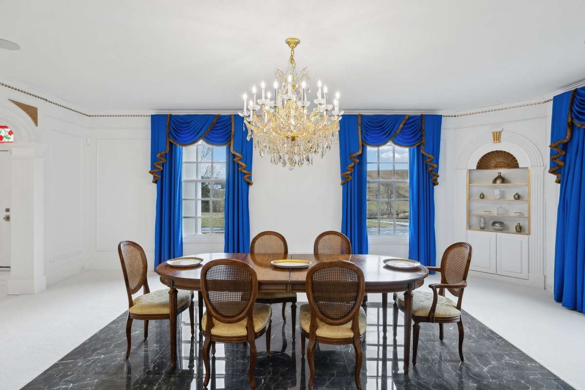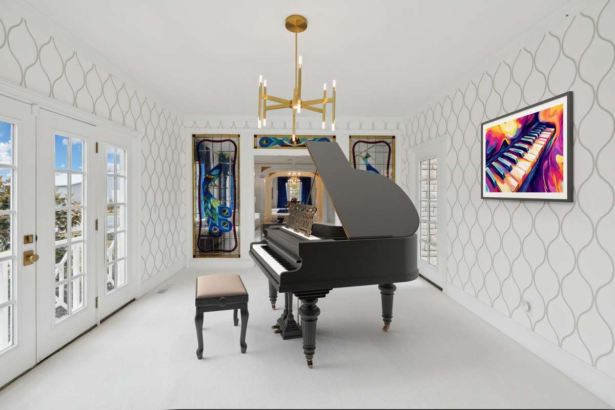 The stately stone exterior—accented by signature columns and green shutters—makes a striking first impression. Inside, richly detailed interiors include stained glass accents, formal living and dining rooms adorned with custom trim work and a crystal chandelier, and specialty spaces like a themed den and a sound- ready music lounge—perfect for entertaining.