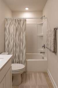 The primary bathroom offers a spacious double vanity, large mirror with modern lighting, and a walk-in shower. Conveniently connected to the primary suite and walk-in closet, it creates a seamless and private retreat