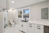 Inside, enjoy refinished original hardwood floors, all- new windows, and a designer quartz kitchen featuring a new gas range, smart appliances, and curated selections that anchor the home’s sophisticated aesthetic. Both bathrooms have been transformed into spa- inspired retreats, offering a luxurious daily living experience. Major improvements—including new electrical, new plumbing, and a tankless water heater—provide the confidence of a true turnkey renovation.