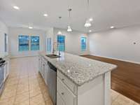 tile backsplash, and a stainless- steel appliance package. Beautiful flooring flows