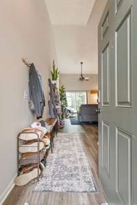 Beautiful, modern Spring Hill, TN Townhome! This home boasts vaulted ceilings, stainless steel appliances, and a back patio that backs up to a wooded area - perfect for private mornings or evening entertaining. This model is the Belden Floorplan which is an open concept, 2 bed, 2. 5 bath home, and it feels so spacious and inviting. Shiplap in dining area adds a feature wall and new floors on main level bring this model up to date. Soaking tub and separate shower in primary. Lots of natural light. Well maintained. Located right across from the pool/ gym/ clubhouse for convenience, this well maintained property is perfect as a starter home, right size home or downsize. Large two car garage and wide closets are ideal for storage. Don' t miss this opportunity to get into this community!