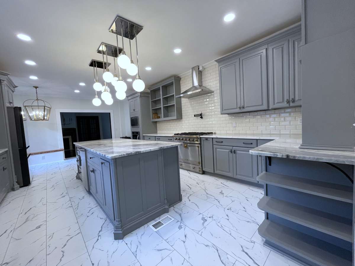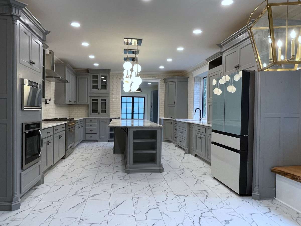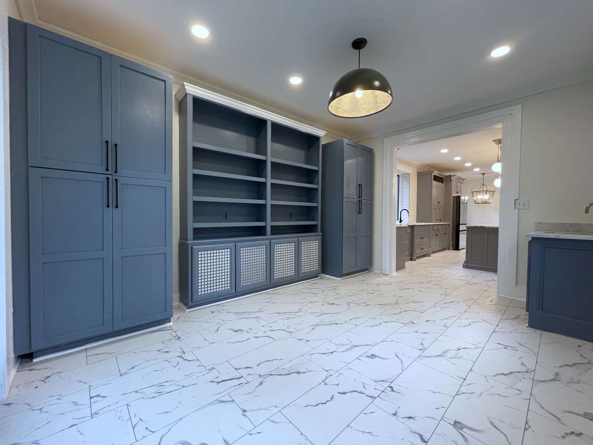 Inside, the main level unfolds with timeless charm. The formal dining room, highlighted by double swinging doors, built- ins, moldings, and a fireplace, invites gatherings both elegant and cozy. The living room offers another classic fireplace, while sunlight streams into the airy family room. The kitchen is the heart of the home, pairing old- world beauty with modern craftsmanship: a French LaCornue gas range and custom vent hood, marble counters, stainless appliances, an oversized island, a live- edge breakfast bench, and floor- to- ceiling cabinetry with oversized pantry. A main- level primary suite with full bath, laundry room, and guest bath complete this level with convenience and style.