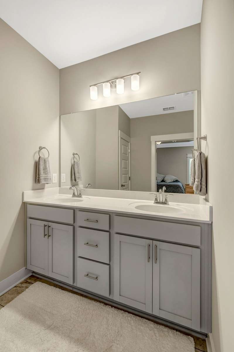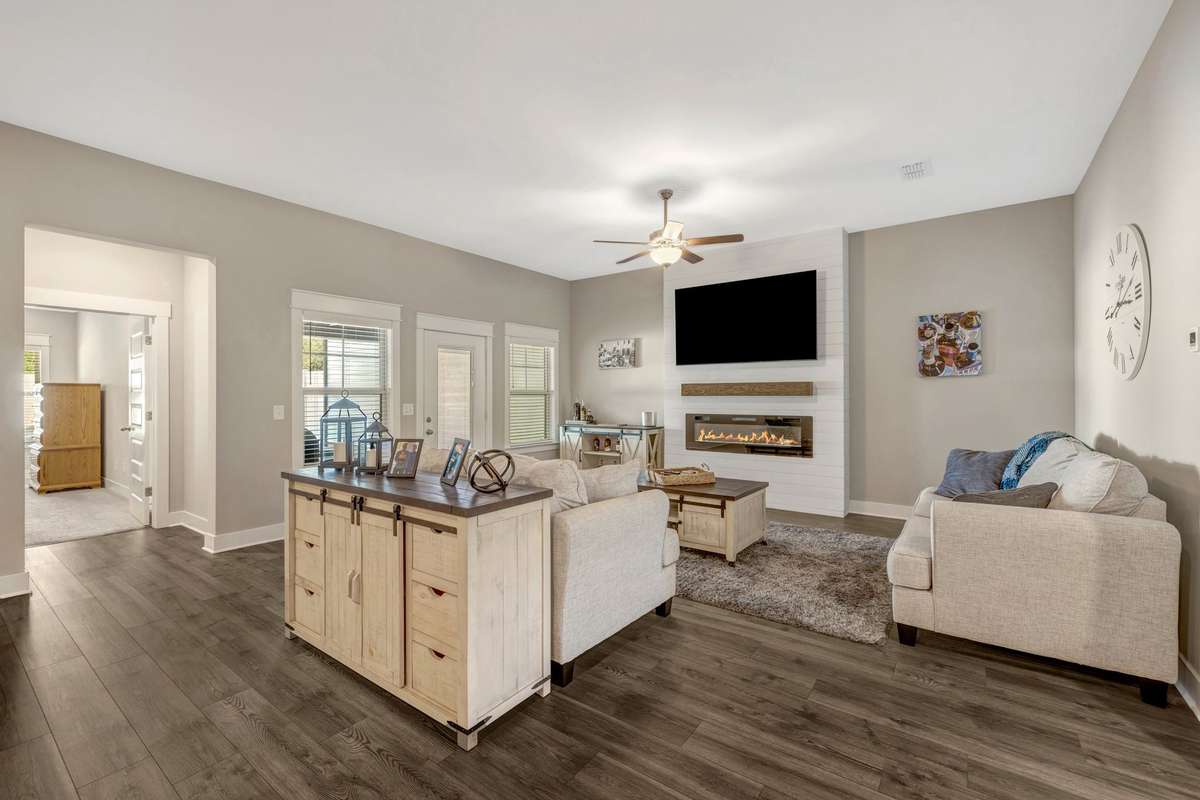 The fiber- cement and stone exterior pairs with accent wood trim in the entry for a warm, upscale welcome. Inside, an open- concept design seamlessly connects the kitchen, dining, and living areas, creating a spacious flow perfect for entertaining. The chef’s kitchen features a generous granite island, under- cabinet lighting, and abundant cabinetry for effortless storage.