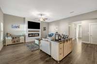 Living Room with ship lap casing, electric fireplace