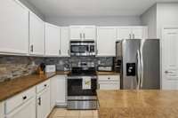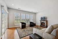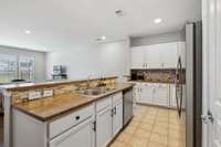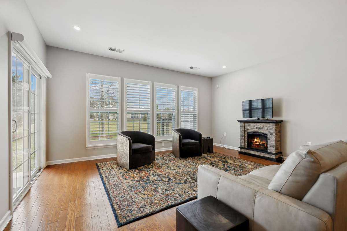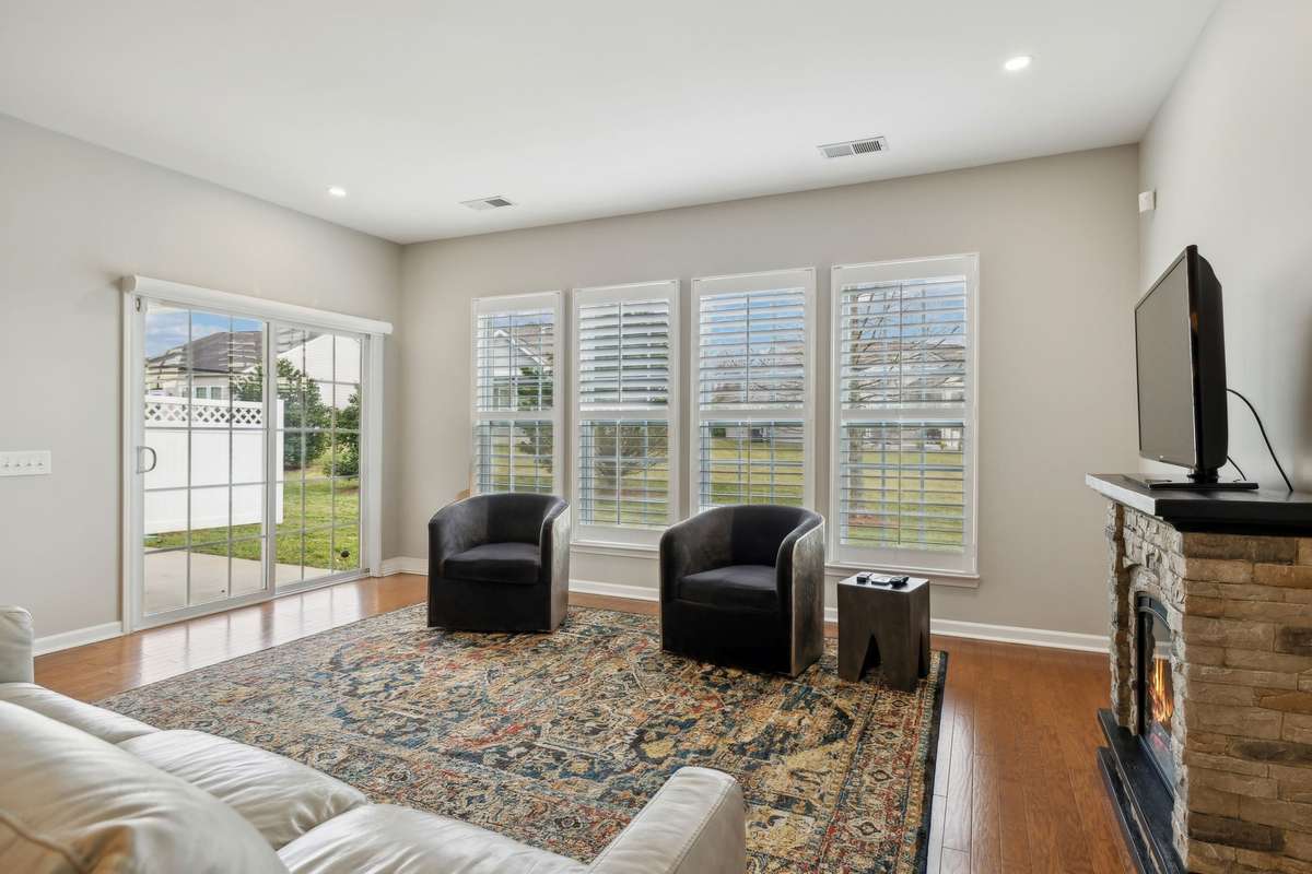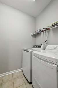 Elegant plantation shutters allow for natural light and privacy. The living room includes recessed ceiling lighting and an electric- heated decorative fireplace, perfect for cozy evenings. The kitchen shines with white cabinetry, stainless steel appliances and under- cabinet LED lighting. The Lakeshore plan includes a built- in pantry. Both the washer and dryer are also included for added convenience. Water heater is less than 1 yr old.