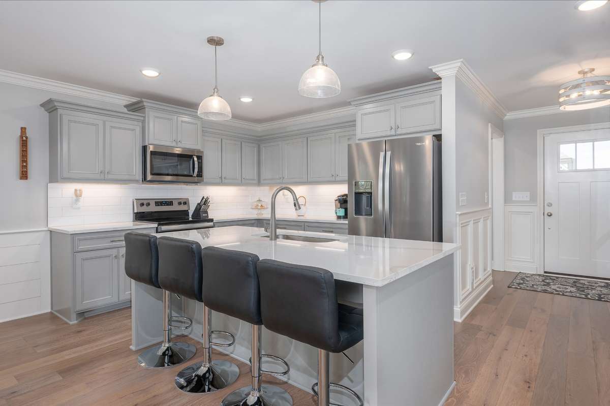 Beautifully designed home featuring a charming covered front porch and stunning golf course views from the back covered patio. This spacious property offers 4 bedrooms and 2. 5 bathrooms, with the primary suite conveniently located on the main level. The primary bath has double vanities with quartz tops, a large soaking tub, and a separate shower. The inviting living room showcases hardwood floors and a stone fireplace, while the island kitchen impresses with custom maple cabinets, quartz countertops, tile backsplash, hardwood flooring, microwave, and dishwasher. Additional highlights include tile flooring in all bathrooms, a full utility room, and a 22x15 recreation room pre- wired for surround sound. Conveniently located near the Gallatin Civic Center, shopping, and dining.