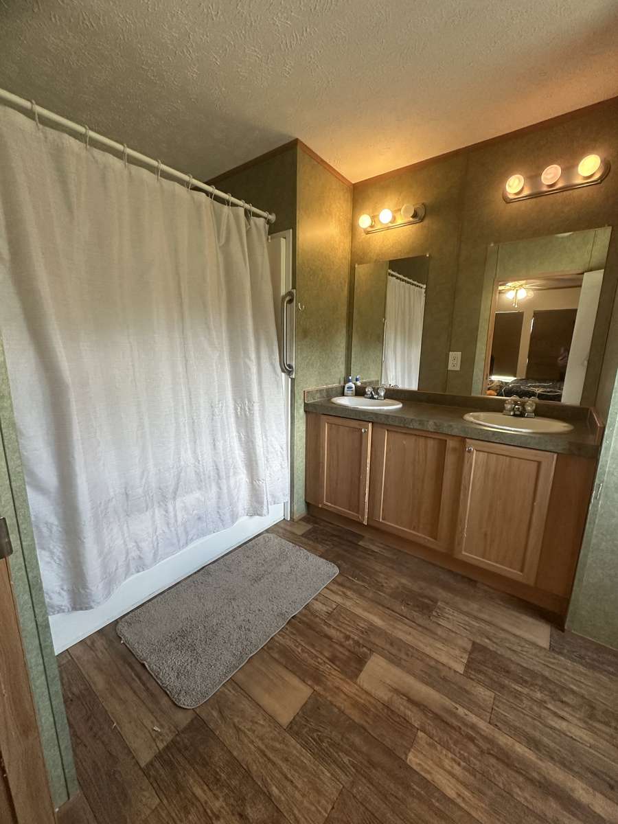 The spacious master suite features double sinks and a large garden tub, perfect for relaxing at the end of the day. Outside, the wooded area behind the home offers a serene backdrop for outdoor living, with plenty of room for pets or small farm animals.
