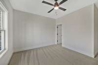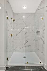 The main level primary suite is truly a retreat, boasting generous space and a spa- like bathroom with double vanities, quartz countertops, tile flooring, and a marble tiled shower. The custom walk- in closet with built- in shelving adds a luxurious touch.