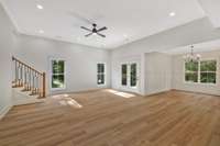 Step inside to a welcoming entry foyer, where you' ll find a full bathroom and private bedroom tucked conveniently to the side perfect for guests or a home office. The heart of the home is the open- concept living room and designer kitchen, featuring soaring ceilings and a formal dining area, ideal for entertaining.