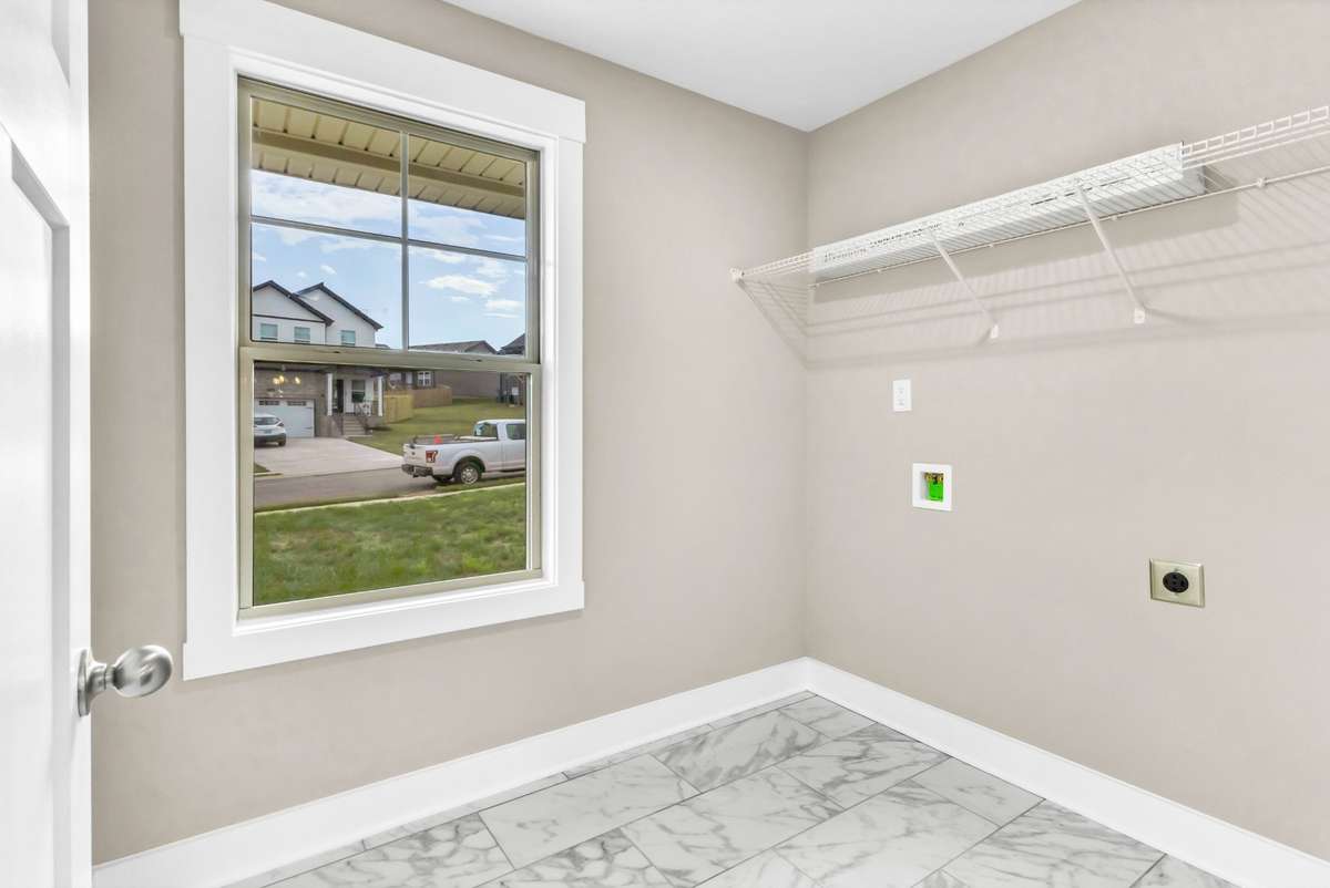 Spacious walk-in laundry room located just off the kitchen, featuring elegant tile flooring, a large window for natural light, and convenient main-level access.