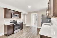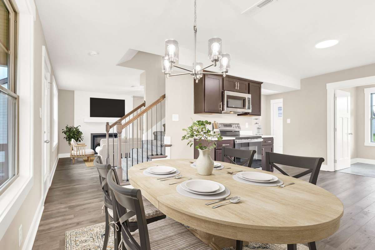 Bright and spacious kitchen featuring rich espresso cabinetry, granite countertops, stainless steel appliances, and a dedicated dining area.