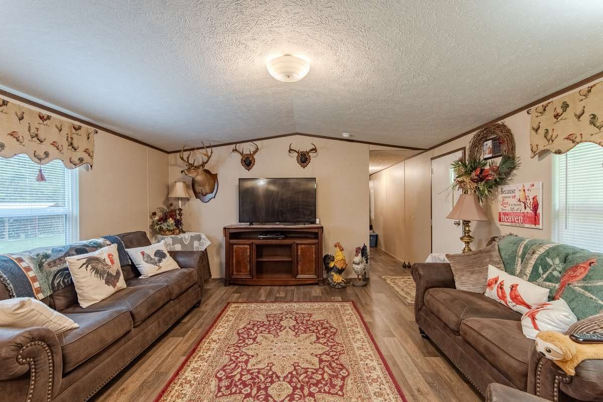 Motivated Seller! Well- maintained 2023 mobile home in the country on approximately 3 acres offering peace and privacy with a beautiful creek. This 3- bedroom, 2- bath home has a spacious living room with open floor plan eat- in kitchen and master suite. Storm shelter, 2 nice barns and fenced for your animals. No restrictions!