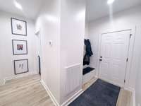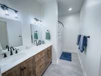 The primary suite offers a private retreat with a spacious bathroom featuring double vanities and a large walk- in shower.