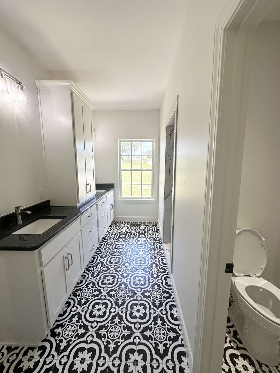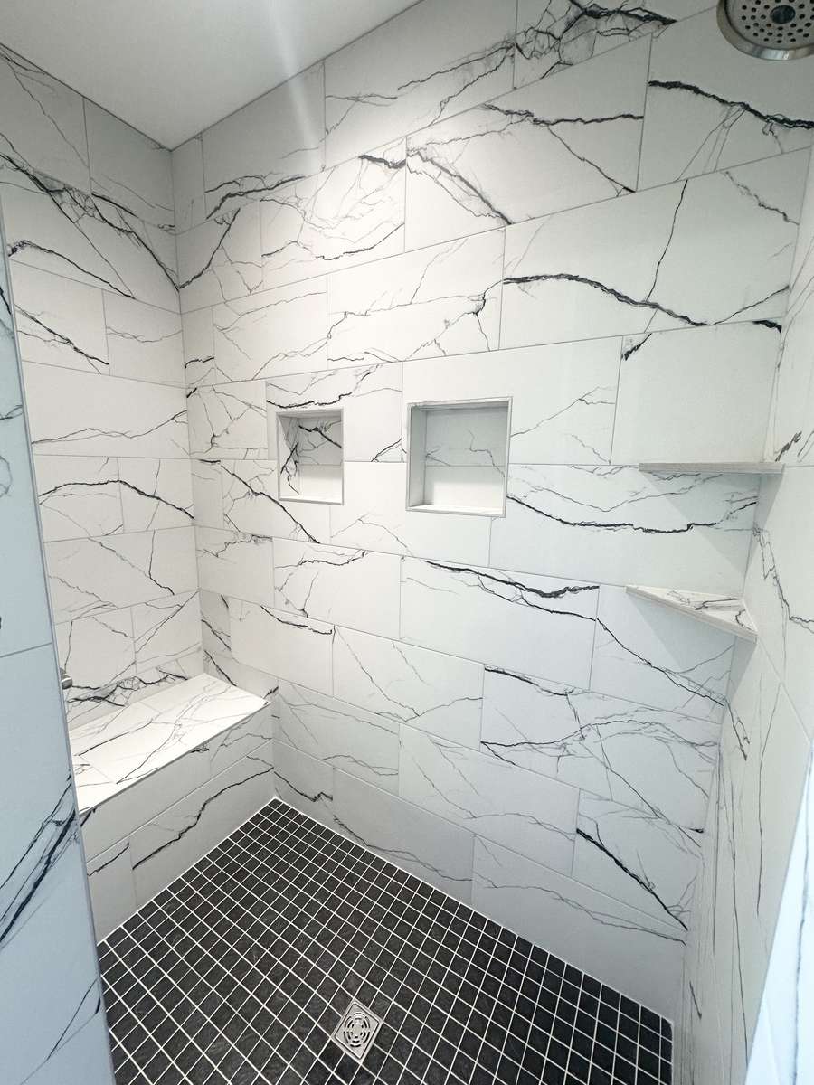 with a walk in shower with beautiful detailing, and a double vanity complete with storage. Another custom