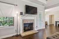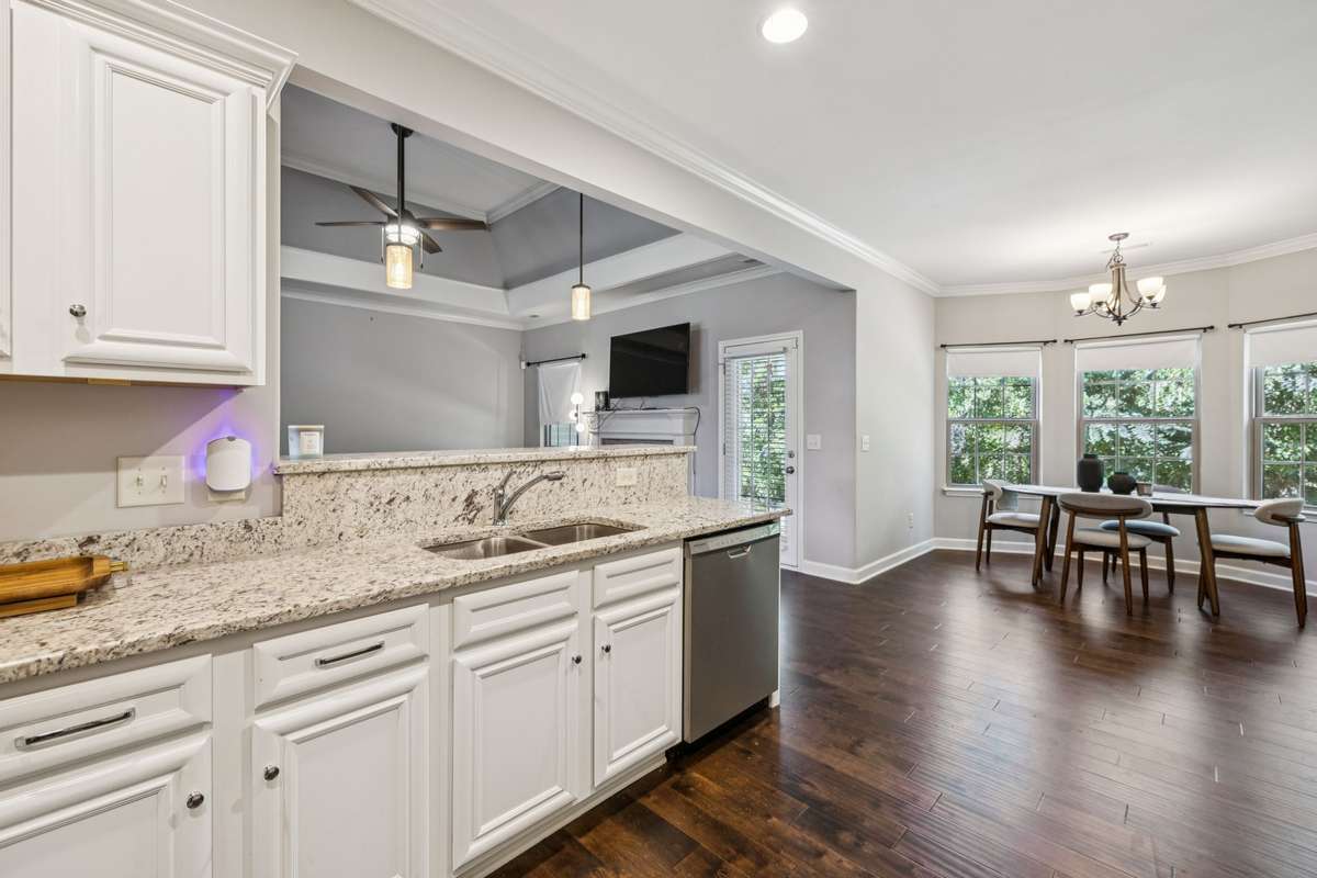 The open concept floorplan features a cozy fireplace in the living room and a kitchen that truly shines with stainless steel appliances, granite countertops, a peninsula with seating for four, and an extended dining area ideal for gatherings. All appliances remain—including stove, microwave, dishwasher, refrigerator, washer, and dryer—making this home move- in ready.