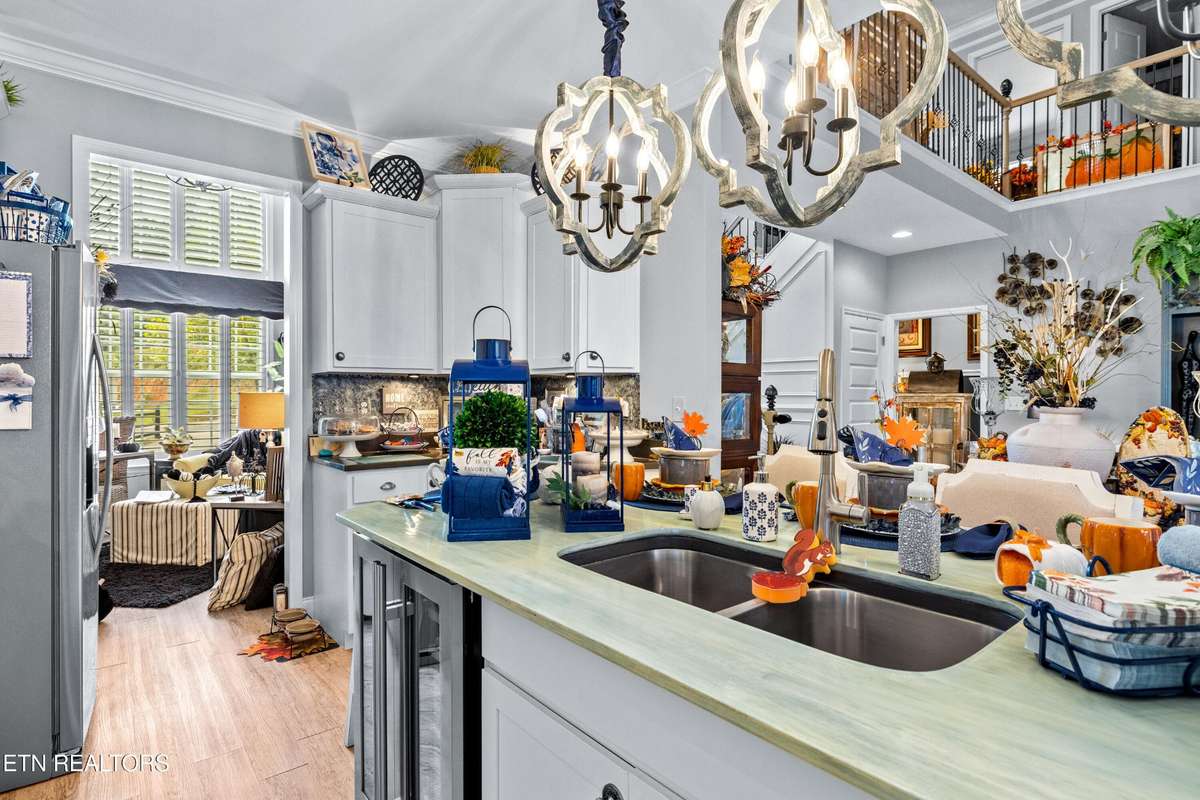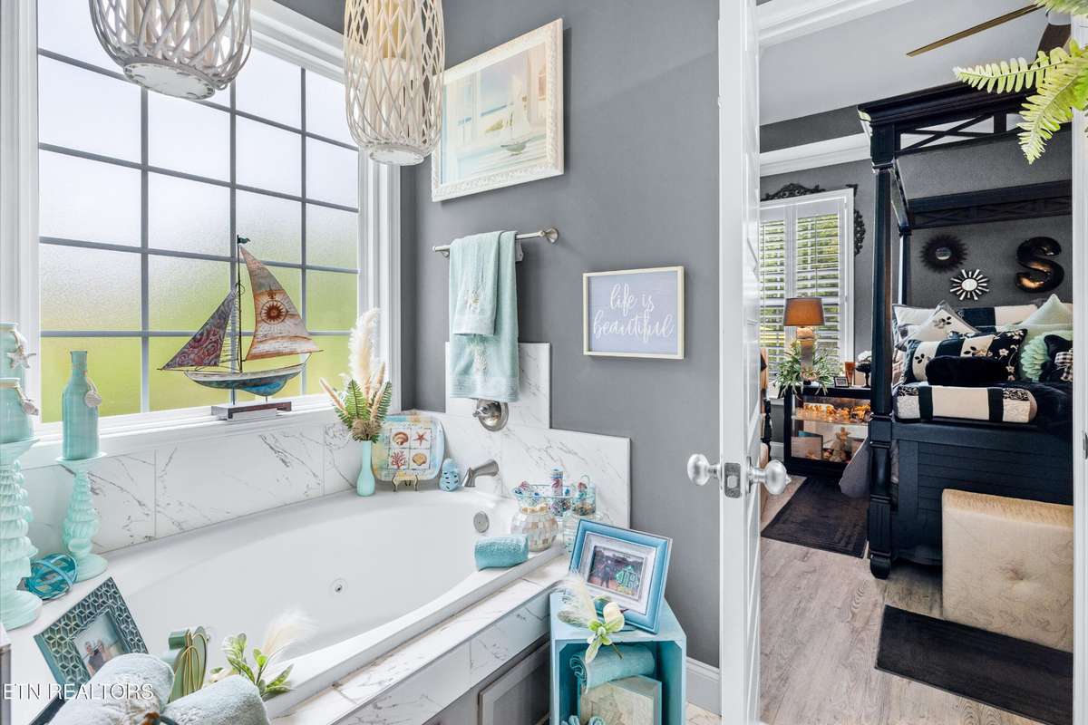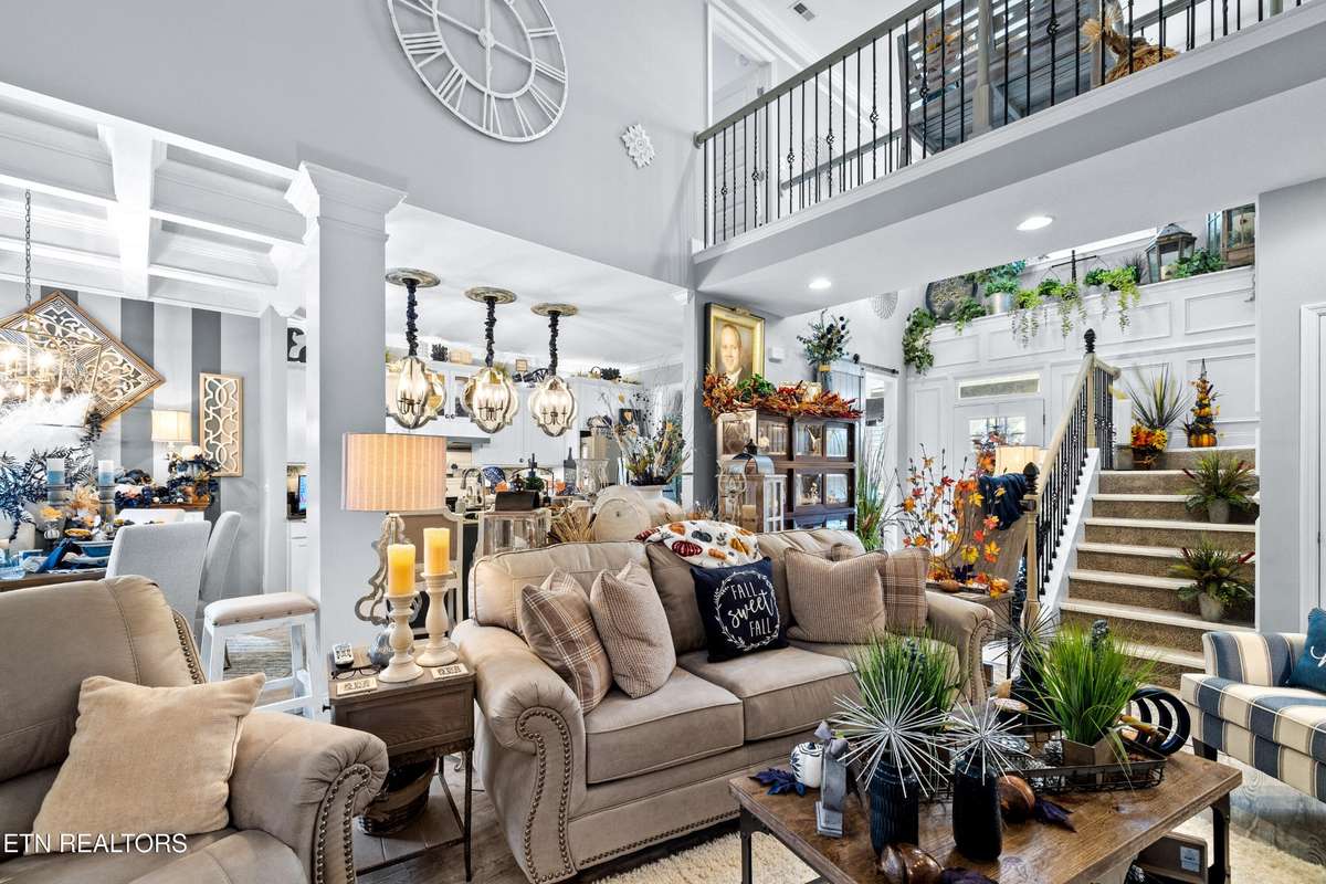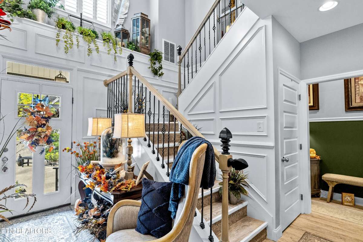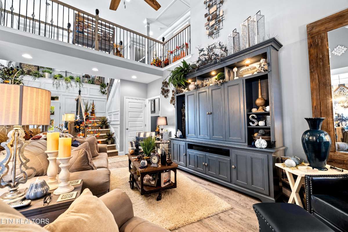 Welcome to this beautiful Lenoir City home, featuring thoughtfully designed finishes and plenty of living space. Inside you will find interior trim details that include crown molding, wainscoting, 5- panel molded doors, decorative beams in the living room and a coffered ceiling in the eat- in kitchen. The main- level primary suite features a grand trey ceiling with crown molding, a jetted tub, walk- in tile shower and walk- in closet. The kitchen is open to the living room with a large island, perfect for entertaining. Stainless steel appliances, including the refrigerator and wine fridge, complete the kitchen. Custom shutters and blinds accent every room including the garage. All bedrooms including the great room and bonus room have ceiling fans. Cable is hardwired in all rooms and the garage. The dining room can also serve as a sitting area or home office. Upstairs offers two additional bedrooms and one bath, plus a large bonus room with a walk- in closet, giving flexibility for guests or hobbies. Outdoor spaces include a screened deck overlooking the retention pond, where summer cattails create a beautiful natural backdrop. The screened deck features additional screening installed beneath the deck boards, plus a vaulted tongue- and- groove ceiling accented by a beam and ceiling fan. It is also pre- wired for cable, making it easy to enjoy TV outdoors. There are multiple flagstone patio areas in the backyard and around the retention pond which are perfect for relaxing and entertaining. Located at the end of the street and within city limits, this home combines comfort, style, and privacy. Buyer to verify all information including square footage.