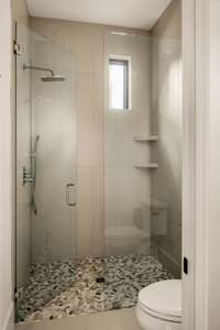 Upstairs, the primary suite feels like a private sanctuary, complete with a spa- level bath and a custom walk- in dressing room designed to make everyday routines feel cinematic. Two additional bedrooms and a spacious flex area round out the second floor, offering versatility for work, play, or creative pursuits. On the top floor, a light- filled bonus room opens to an outdoor porch, complete with a half bath nearby, creating the perfect setting for movie nights, workouts, or sunset cocktails.