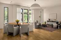 On the main floor, the kitchen is effortlessly refined with Taj Mahal quartzite wrapping the counters, backsplash, and integrated sink in a seamless sweep of natural stone. Fully integrated appliances and custom cabinetry keep the aesthetic calm and elevated. You’ll also find two bedrooms on this level, ideal for guests, a home office, or flexible living.