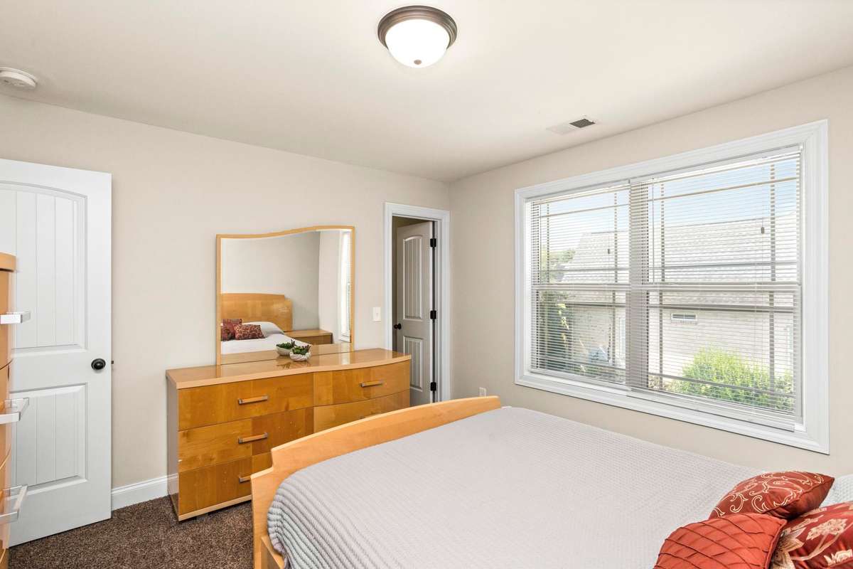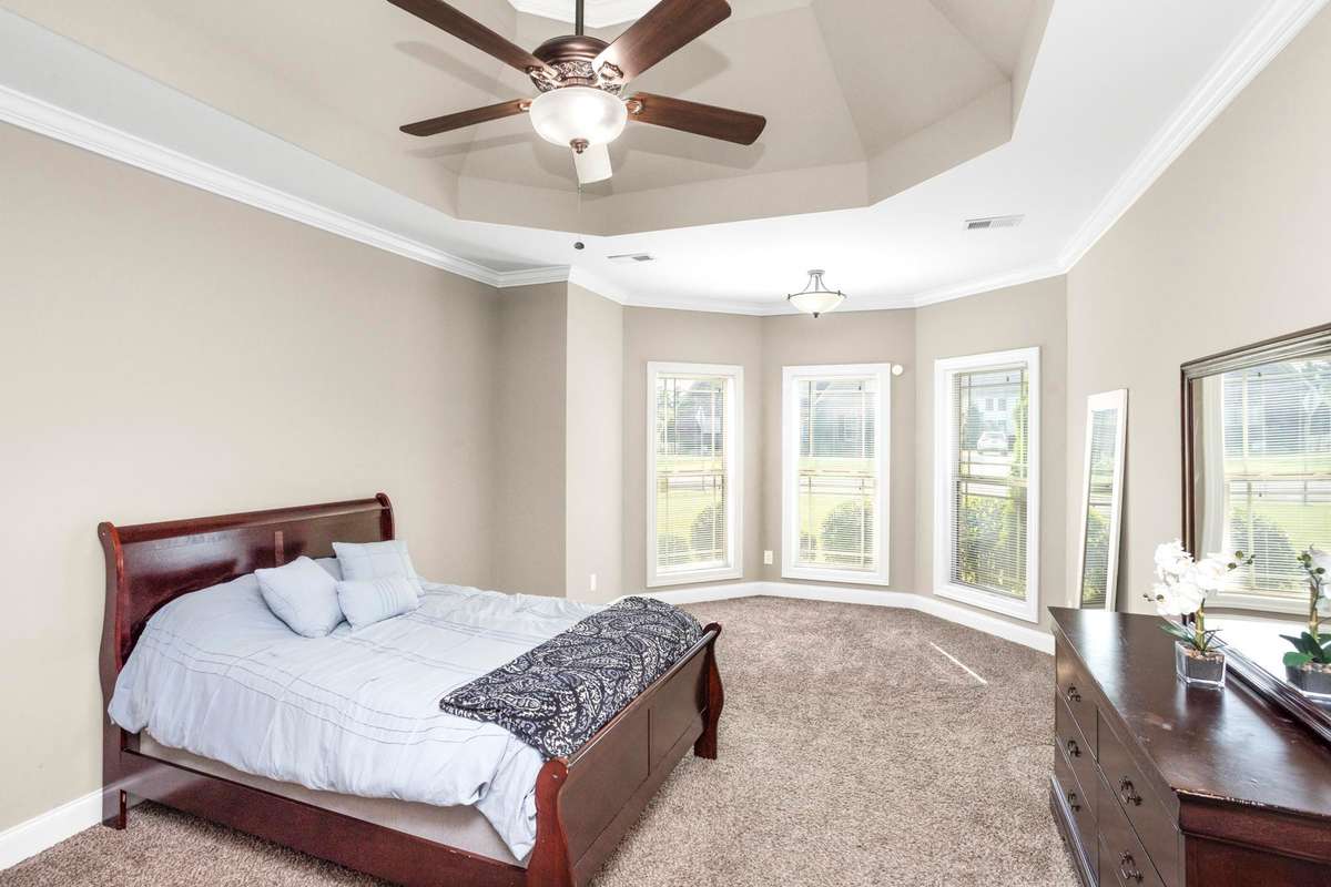 The primary bedroom is so welcoming and spacious! Bay windows let the light flow in!