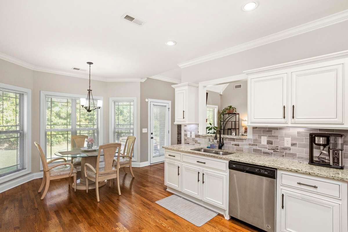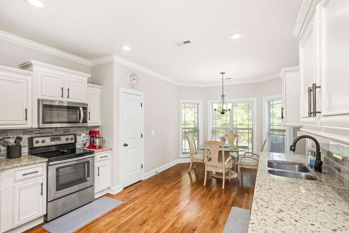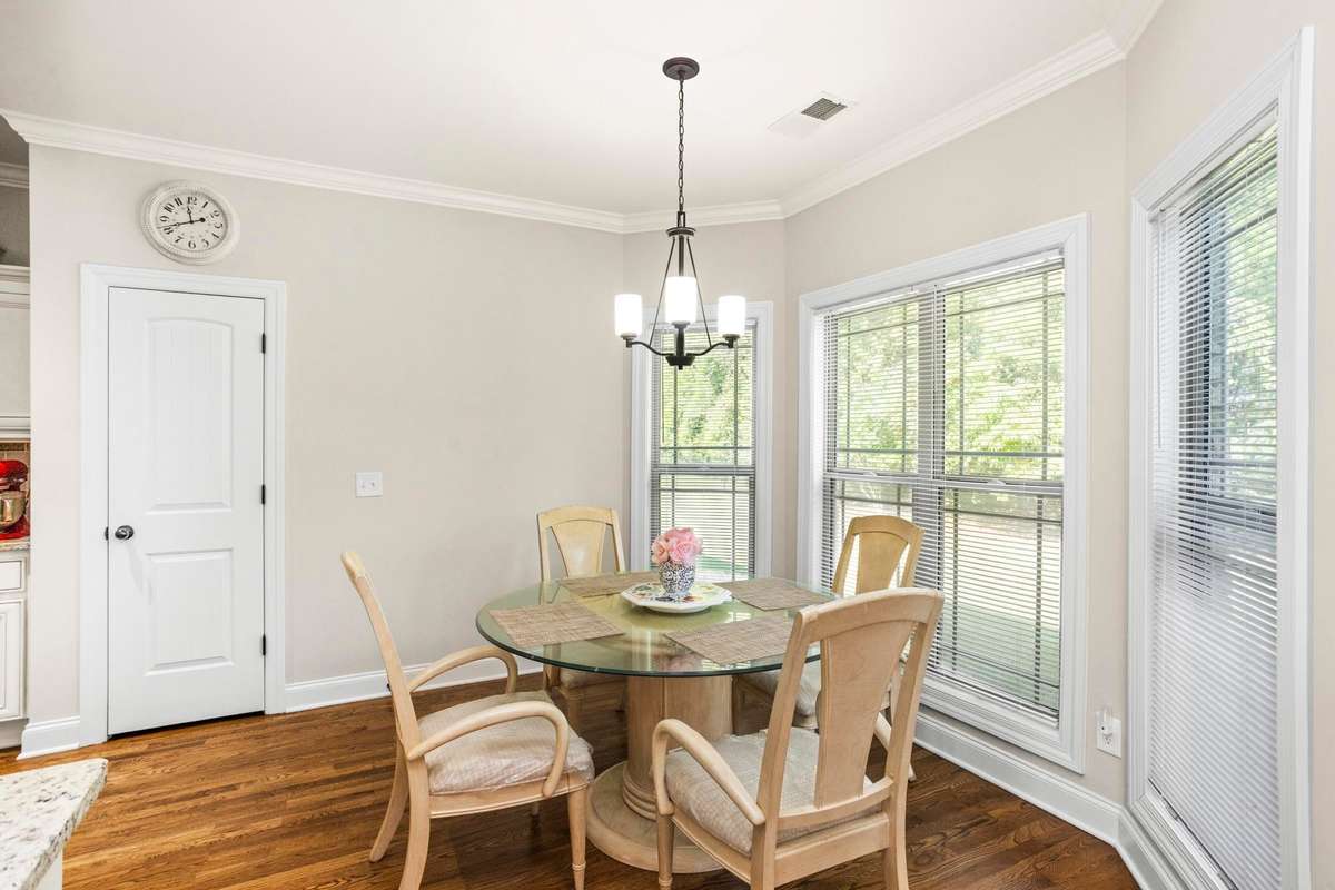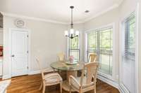 The dining room has beautiful molding and wainscotting which adds so much character and charm to the space!