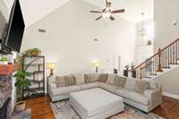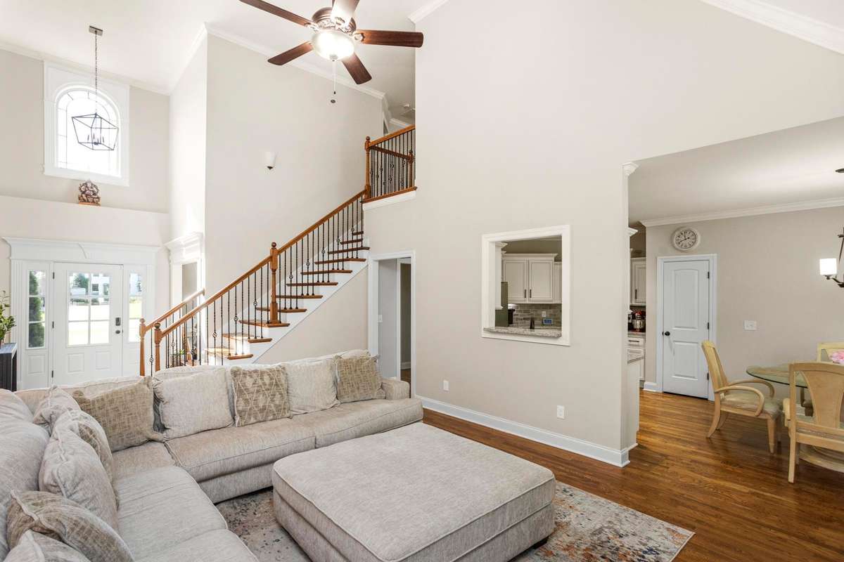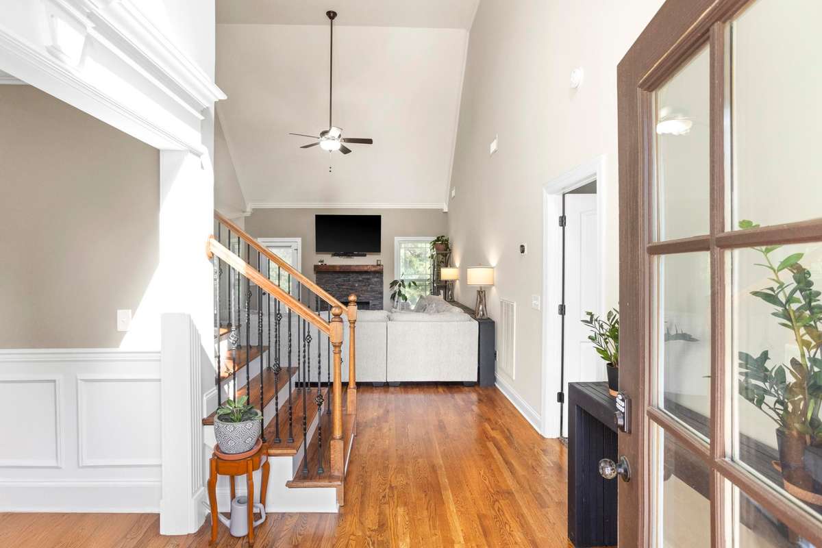 Just inside the foyer, the dining room is located to the left, the living room ahead, and the primary suite to the right.