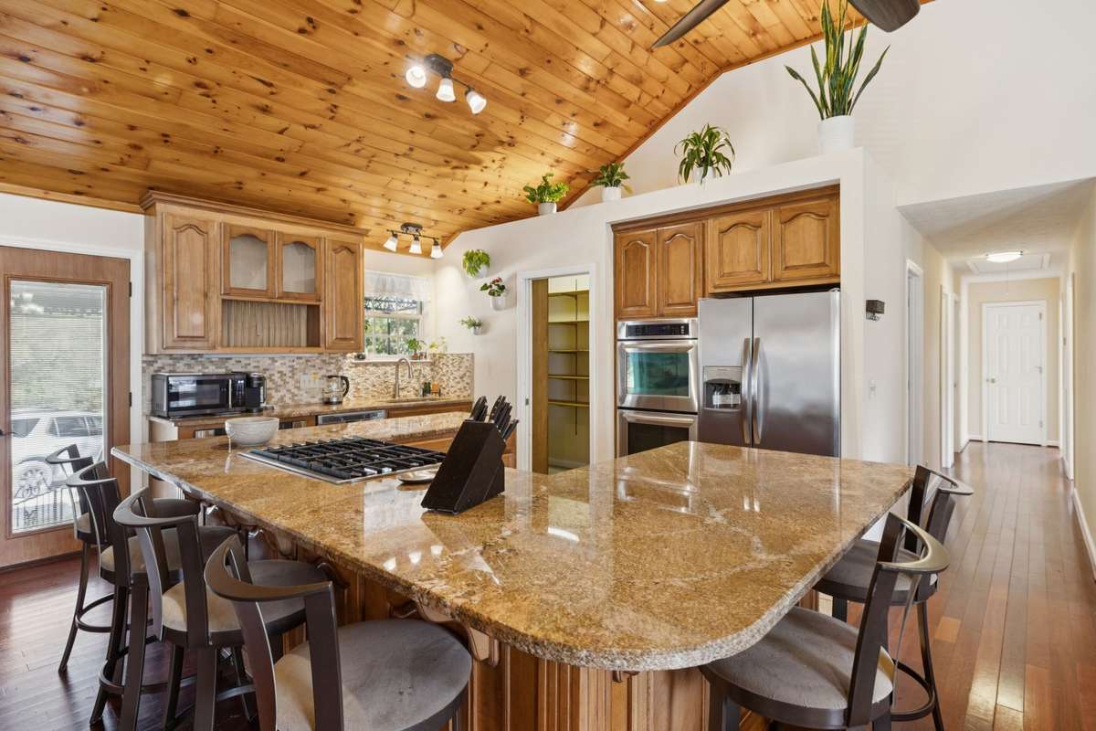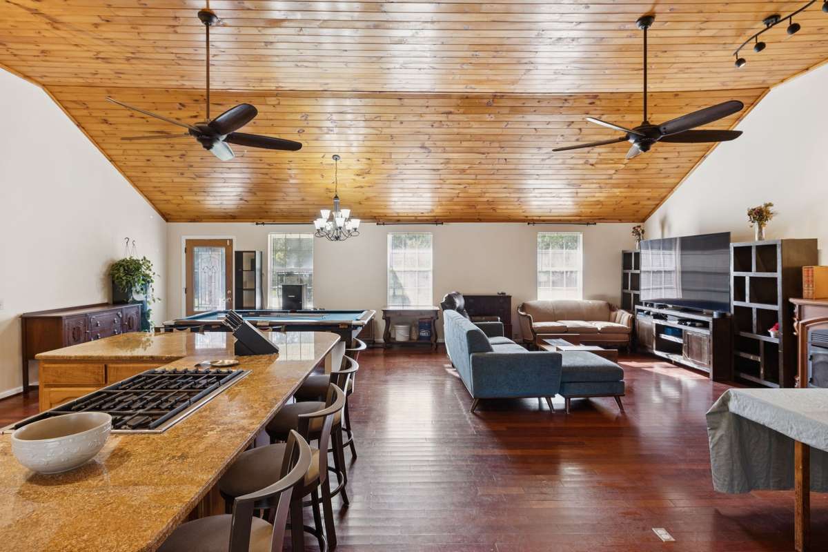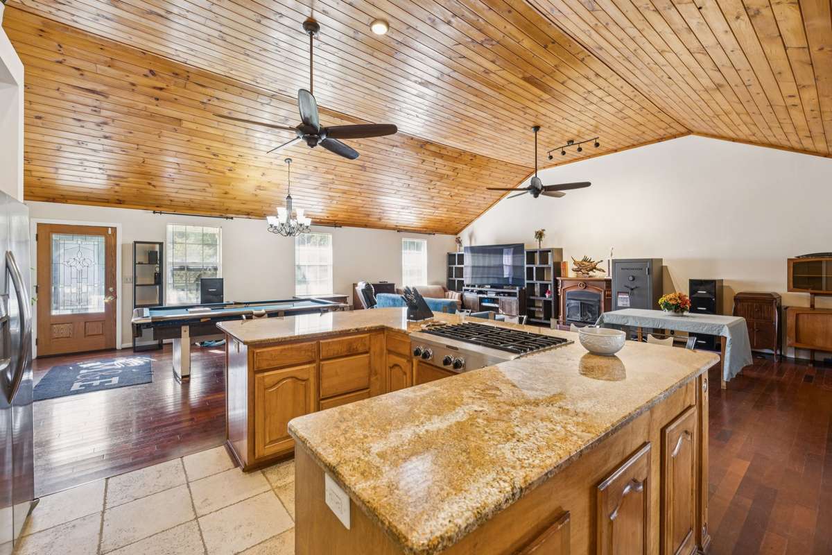 Welcome to this beautiful 3- bedroom, 2- bath all- brick home nestled on 14 acres of serene countryside. Designed with both style and function in mind, the home features an open- concept living area highlighted by a stunning high plank ceiling and an abundance of natural light throughout. The kitchen is a chef’s dream with a gas range, stainless steel appliances, and a large island that offers additional seating—perfect for entertaining or casual family meals.