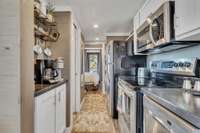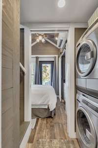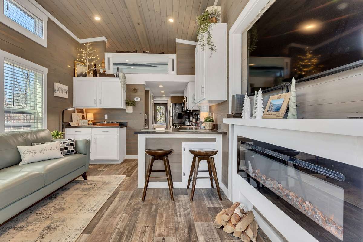 The home offers vaulted ceilings with a surprisingly open feel within its tiny footprint. The kitchen offers an all stainless steel appliance package, including dishwasher. Both the main bedroom and sleeping loft include a queen size mattress.
