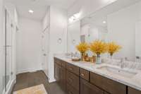 The primary suite? It’s a true retreat. Vaulted ceilings, two walk- in closets with upgraded shelving, and a spa- like bath featuring an oversized shower with bench seating and sunlit windows—it’s the definition of luxury meets comfort.