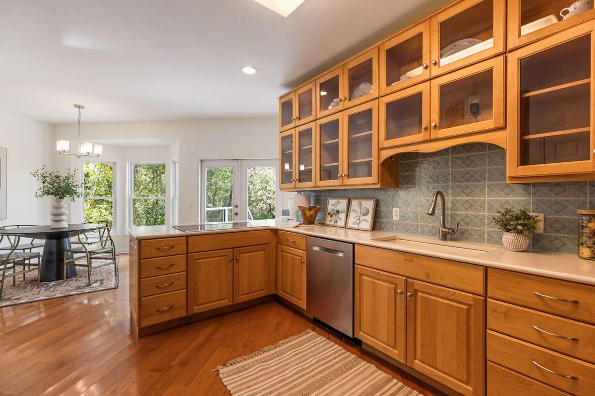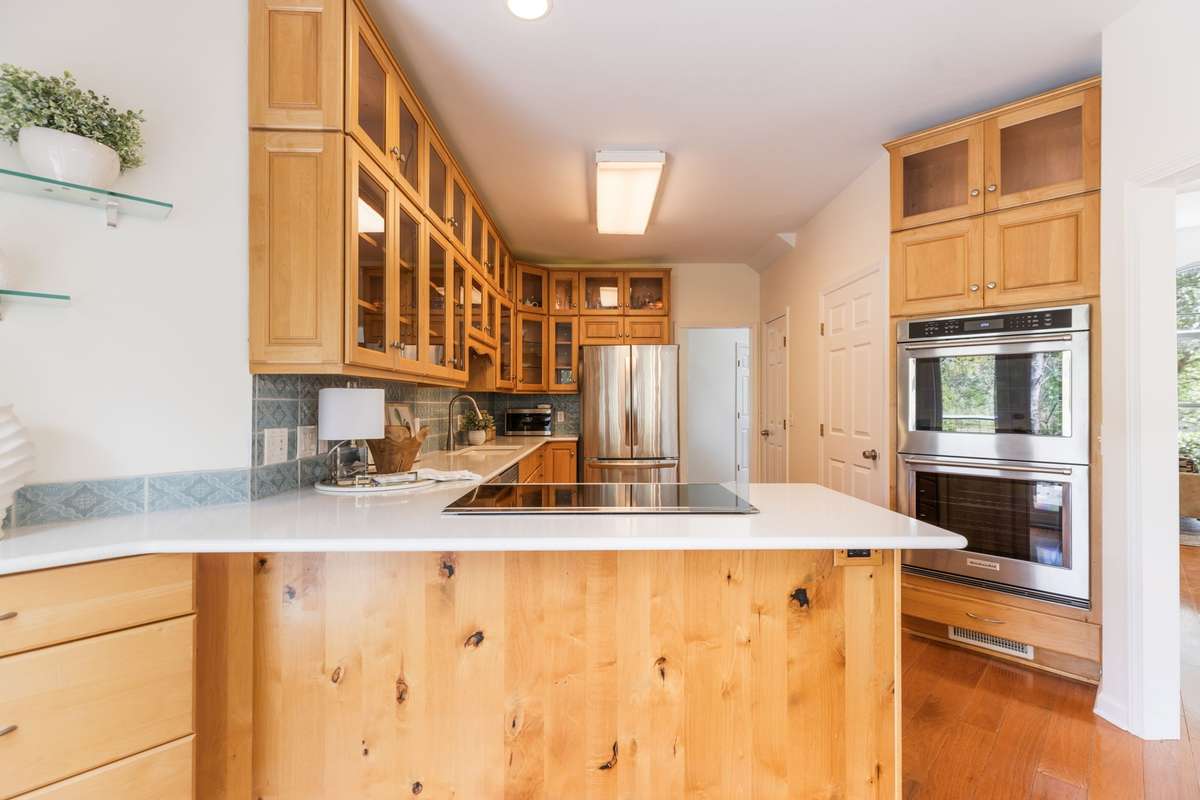 The kitchen features true hardwood to-the-ceiling cabinetry and an induction range