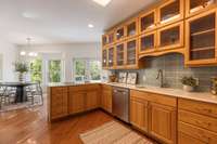 Glass-front cabinetry and beautiful tile backsplash