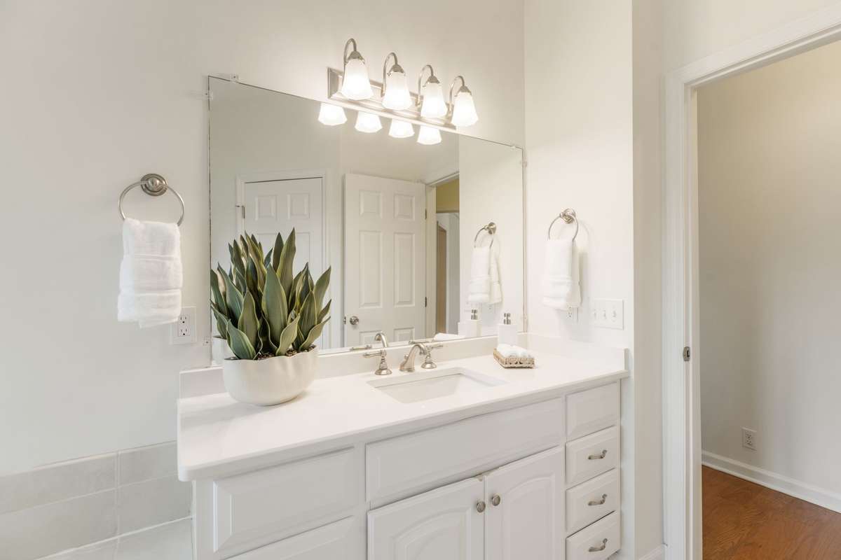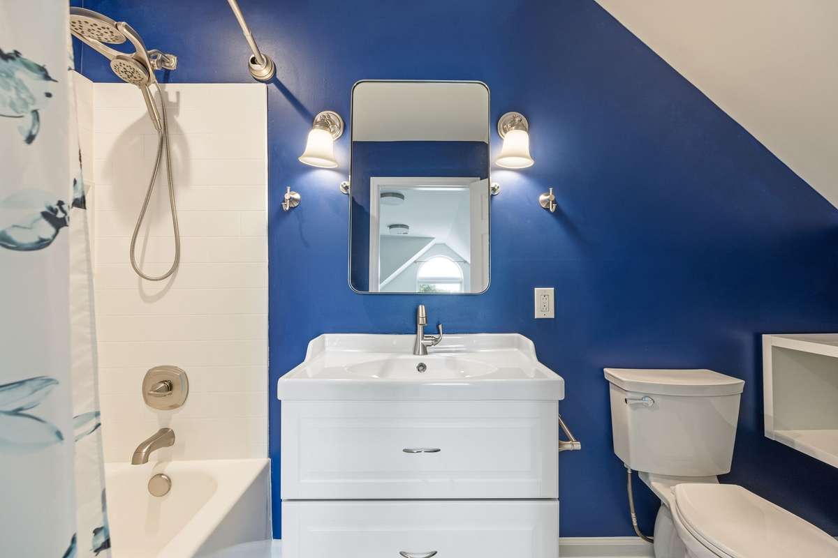 Updated, contemporary bathroom with tub/shower combo and single vanity