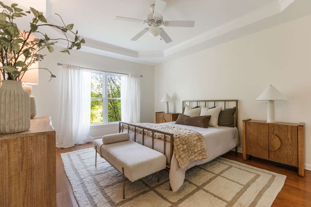 Expansive primary suite with tray ceiling — attached to large en suite bathrom