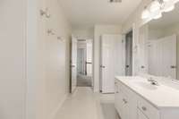Long, spacious bathroom that has a wide doorframe and floors - also has a tub/shower combo