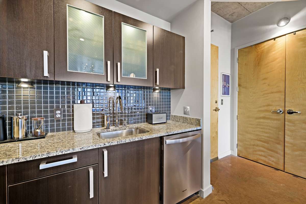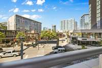 The open- concept design showcases a sleek kitchen with new appliances, polished concrete floors, and an easy flow for entertaining. Step onto your spacious private balcony—perfect for morning coffee or evening cocktails while taking in the vibrant skyline.