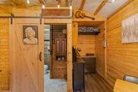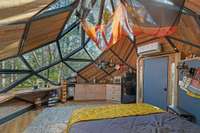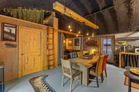 Behind the Dome sits a 20 x 30 structure designed for gathering & relaxation. Inside, you' ll find a welcoming atmosphere with a full kitchen, large dining area, living room with a big- screen TV, full bathroom, office, & two loft- style sleeping areas.