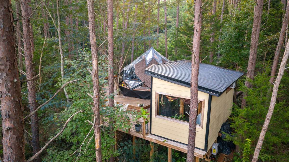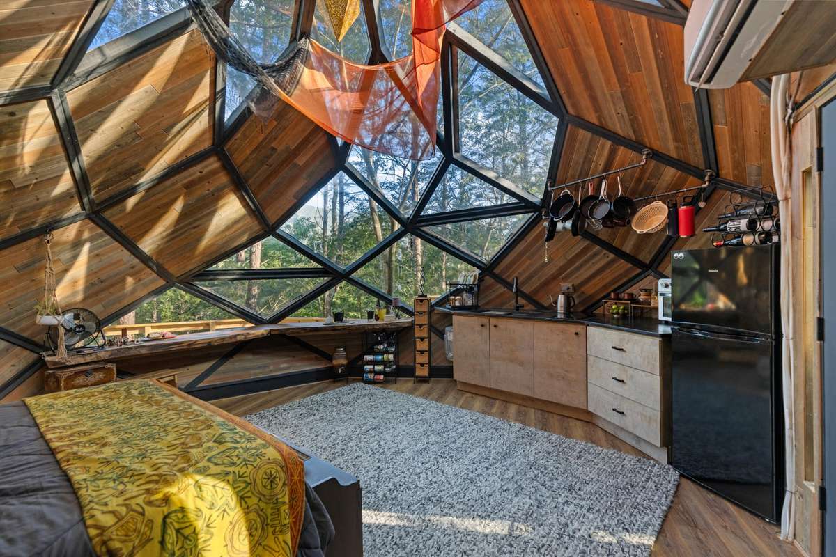 - The property' s centerpiece is a 20 ft circular custom geometric Dome. The Dome is perched high on the hill with beautiful local views. Connected by wood decking, it opens to a charming bathhouse and dressing area, creating an enchanting and functional space with plenty of decking for gathering.