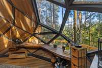 Behind the Dome sits a 20 x 30 structure designed for gathering & relaxation. Inside, you' ll find a welcoming atmosphere with a full kitchen, large dining area, living room with a big- screen TV, full bathroom, office, & two loft- style sleeping areas.