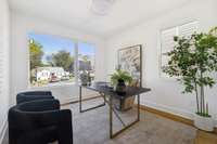 The expansive windows allow natural light to flood the home, highlighting the beautiful hardwood and stone floors as well as custom wainscoting & detailed millwork in the stairway. The home office and library/ den provide versatile spaces for work or leisure.
