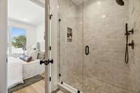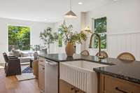 The expansive windows allow natural light to flood the home, highlighting the beautiful hardwood and stone floors as well as custom wainscoting & detailed millwork in the stairway. The home office and library/ den provide versatile spaces for work or leisure.