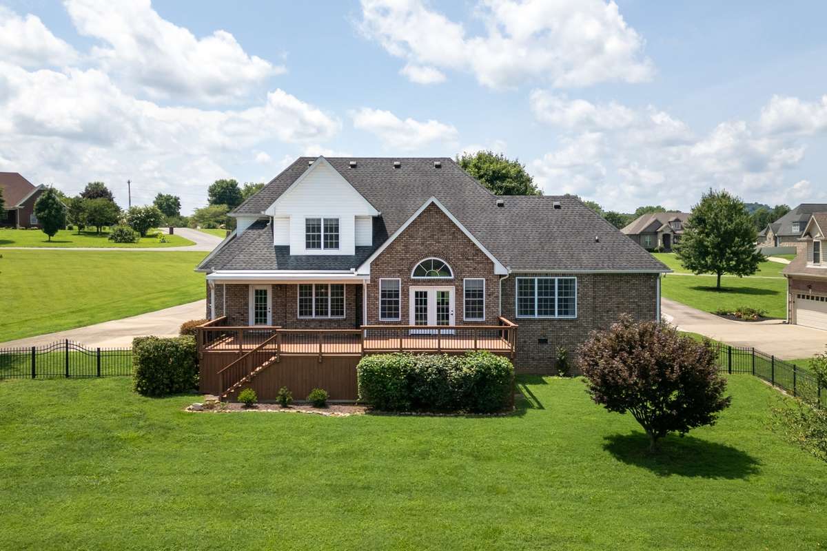 Nice view of back of home with sprawling deck, upgraded wrought iron fencing and lush green grass!